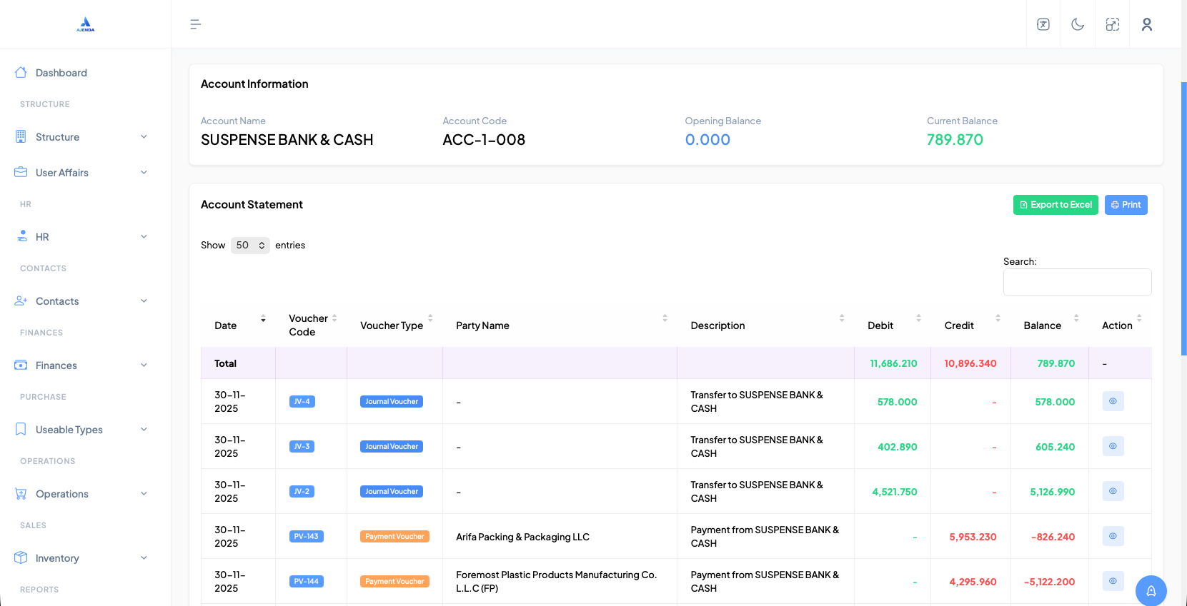 - Modules: Sales, Purchase, Expenses, Vouchers, Reports, Accounts, Settings